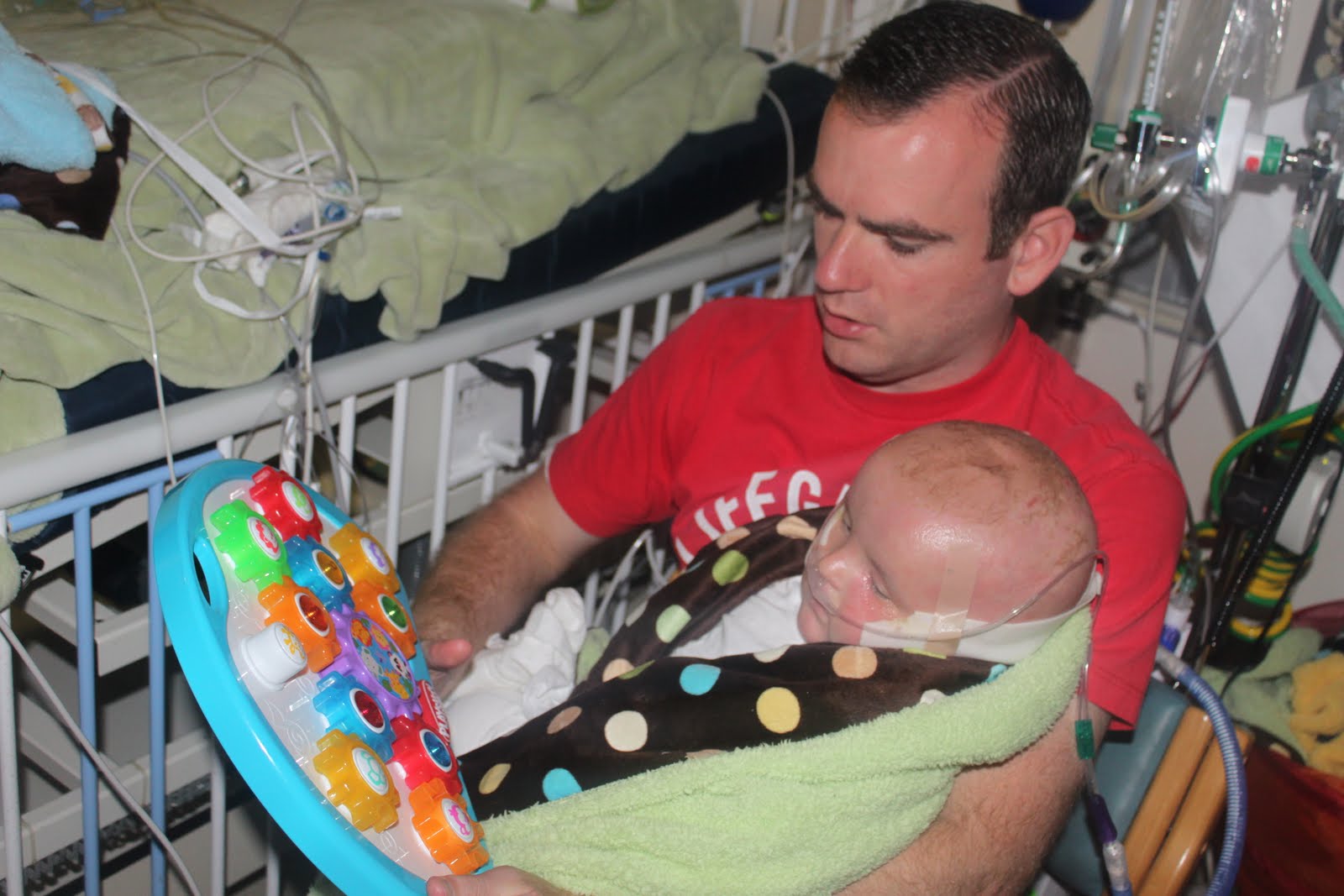 Today was sort of a busy day. First thing this morning (like I was still rubbing the sleep out of my eyes, first thing) Dr. Tolar stopped by in a surprise visit. He evaluated Daylon and told me that we were going to have to push back our 1 pm biopsy appointment until 3pm because of dialysis. While dialysis got set up, Brian and I traded out so I could get a shower. Remember my shopping trip to Target from a week ago? Well, the following day Keira threw up at Sam's club (what is with my kids and that place!) while they were shopping. Brian had to top me! :) Totally kidding! Anyway, I've been trapped here and Brian has been at home trapped with the kids. Three of the four ended up getting it, so it's been over a week. I've just made quick stops home to shower and leave (while the dialysis nurse watches Daylon) so we don't spread the bug to the baby. Well, today we made a nice couple hour trade off. I feel like I've missed so much, being away from them! I loved being able to hang out with the kids for a few hours, while Brian tended to Daylon. Unfortunately, when we switched back, I learned that Daylon had been going crazy thrashing and moaning for the last hour. Several doctors came in to see him, but no one could figure out what was wrong. I, personally think he was tired of sitting in bed for 5 hours, plus he's not a fan of the masks that everyone wears. Either way, he stopped eventually. Dr. Tolar and I got to work removing the dressings shortly thereafter, and Daylon was just too wild and unreceptive to the sedation (shocker) to continue. We'll give the biopsies another go on Wed.